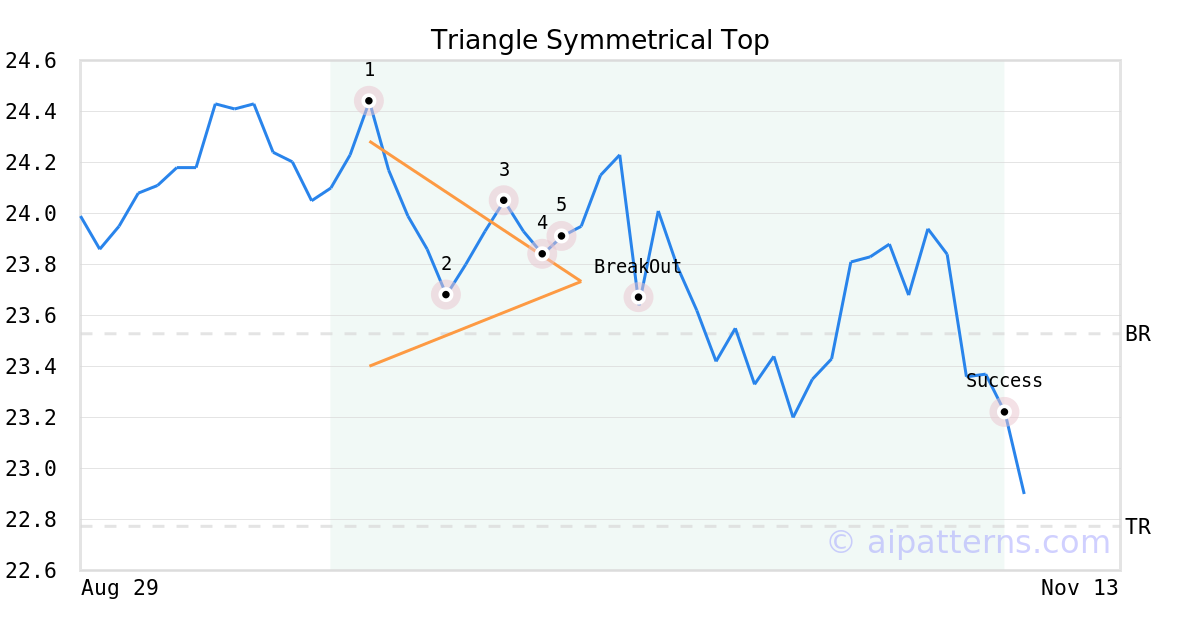 On October 06, 2025, A.I.dvisor detected a Triangle Symmetrical Top Pattern (Bearish) for Eaton Vance Enhance Equity Income Fund II (EOS, $23.76). 4 days later, on October 10, 2025, A.I.dvisor confirmed the Bearish pattern, setting a target price of the stock. On November 06, 2025, the stock hit the target price of $22.77 – resulting in a gain for traders who shorted the stock on the pattern detection date.