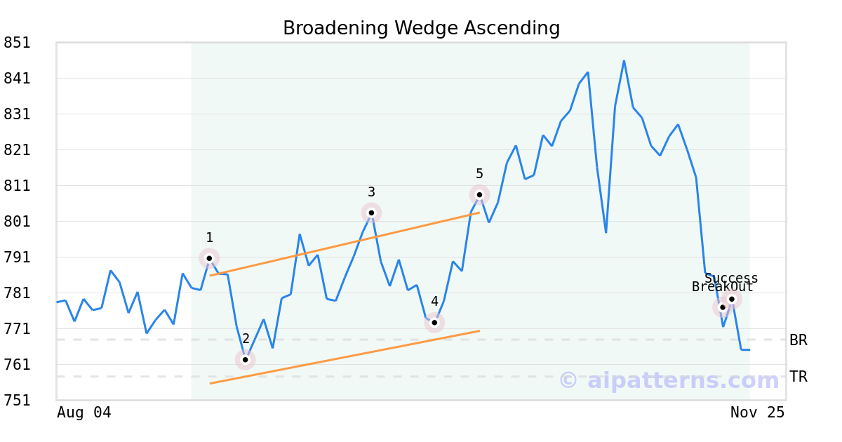 On October 09, 2025, A.I.dvisor detected a Broadening Wedge Ascending Pattern (Bearish) for Equinix (EQIX, $803.46). 39 days later, on November 17, 2025, A.I.dvisor confirmed the Bearish pattern, setting a target price of the stock. On November 18, 2025, the stock hit the target price of $757.63 – resulting in a gain for traders who shorted the stock on the pattern detection date.