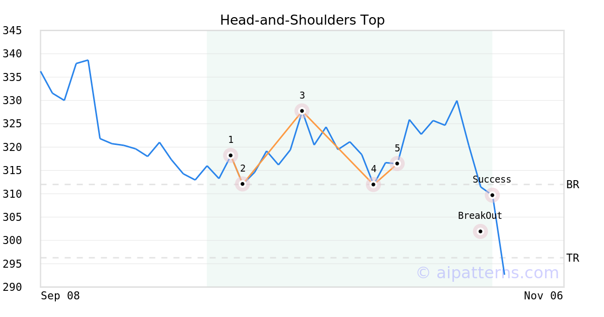 On October 20, 2025, A.I.dvisor detected a Head-and-Shoulders Top Pattern (Bearish) for Erie Indemnity Company (ERIE, $316.42). 9 days later, on October 29, 2025, A.I.dvisor confirmed the Bearish pattern, setting a target price of the stock. On October 30, 2025, the stock hit the target price of $296.28 – resulting in a gain for traders who shorted the stock on the pattern detection date.
