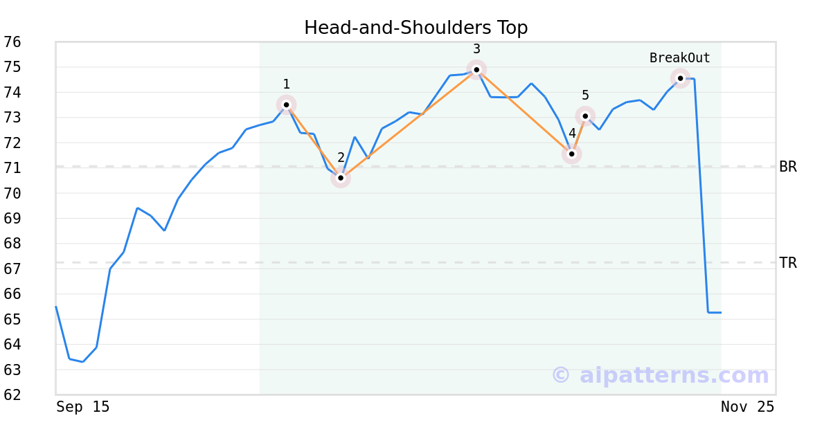 On November 07, 2025, A.I.dvisor detected a Head-and-Shoulders Top Pattern (Bearish) for Eversource Energy (ES, $73.04). 11 days later, on November 18, 2025, A.I.dvisor confirmed the Bearish pattern, setting a target price of the stock. On November 18, 2025, the stock hit the target price of $67.25 – resulting in a gain for traders who shorted the stock on the pattern detection date.