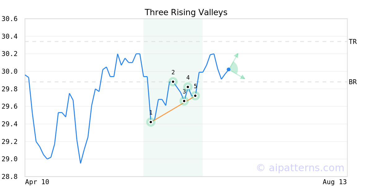 A.I.dvisor detected a bullish Three Rising Valleys pattern for ESECX stock. This pattern was detected on June 14, 2024 . The odds of reaching the target price are 6. The Three Rising Valleys pattern forms when three minor Lows (1, 3, 5) are arranged along an upward sloping trend line. Consider buying a security or call option at the breakout price level. When trading, wait for the confirmation move, which is when the price rises above the breakout level.