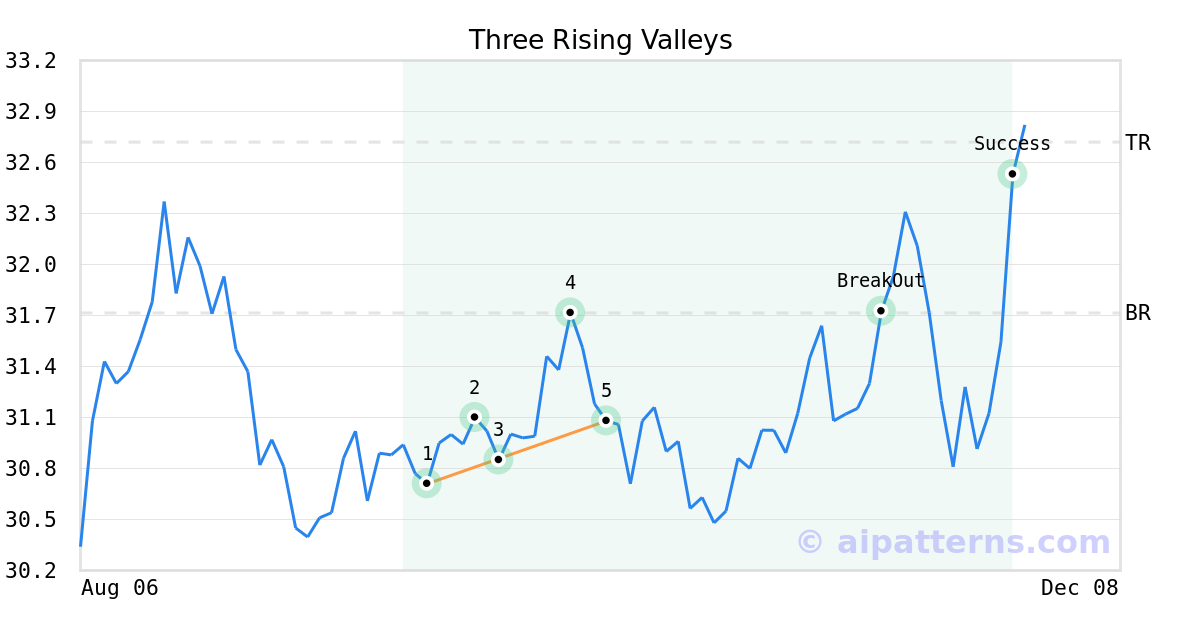 On October 08, 2025, A.I.dvisor detected a Three Rising Valleys Pattern (Bullish) for iShares MSCI Austria ETF (EWO, $31.08). On November 10, 2025, A.I.dvisor confirmed the Bullish pattern, setting a target price of $32.72. 15 days later, on November 25, 2025, EWO reached the target price resulting in a for traders who took a long position in the stock.