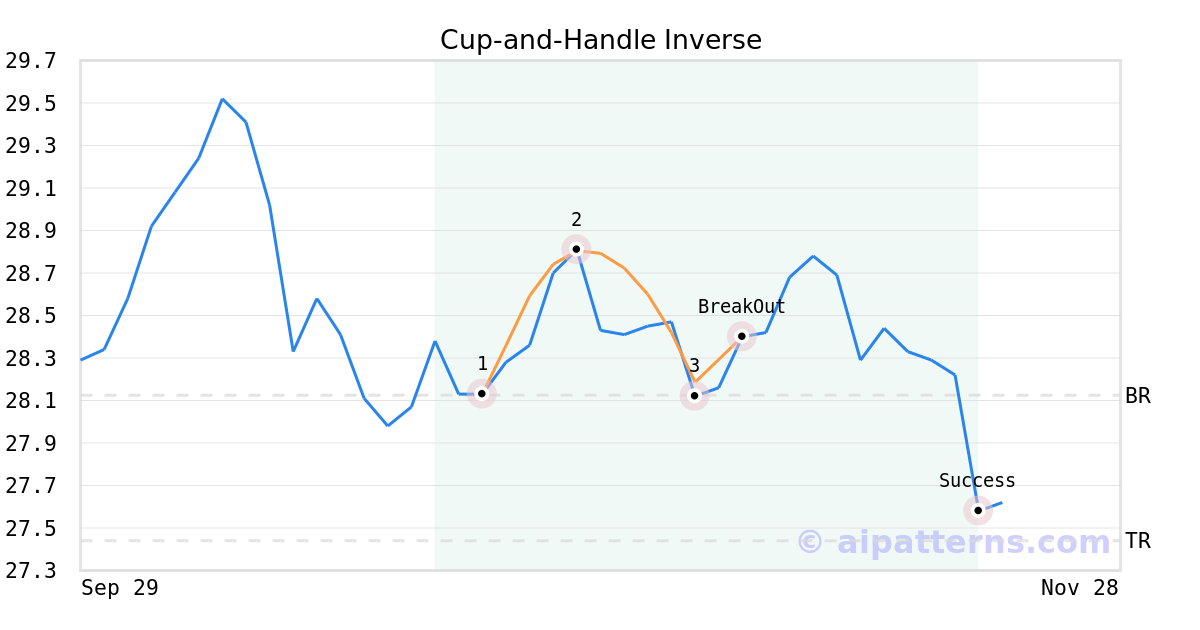 On November 06, 2025, A.I.dvisor detected a Cup-and-Handle Inverse Pattern (Bearish) for iShares MSCI Singapore ETF (EWS, $28.40). On November 06, 2025, A.I.dvisor confirmed the Bearish pattern, setting a target price of the stock. On November 20, 2025, the stock hit the target price of $27.44 – resulting in a gain for traders who shorted the stock on the pattern detection date.