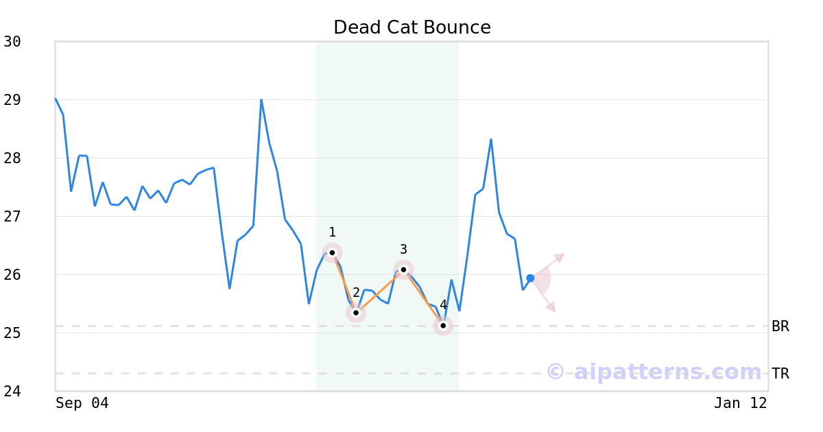 The Dead Cat Bounce pattern appears when a security's price falls quickly but has a temporary “v-shaped” recovery before resuming its downward trend.