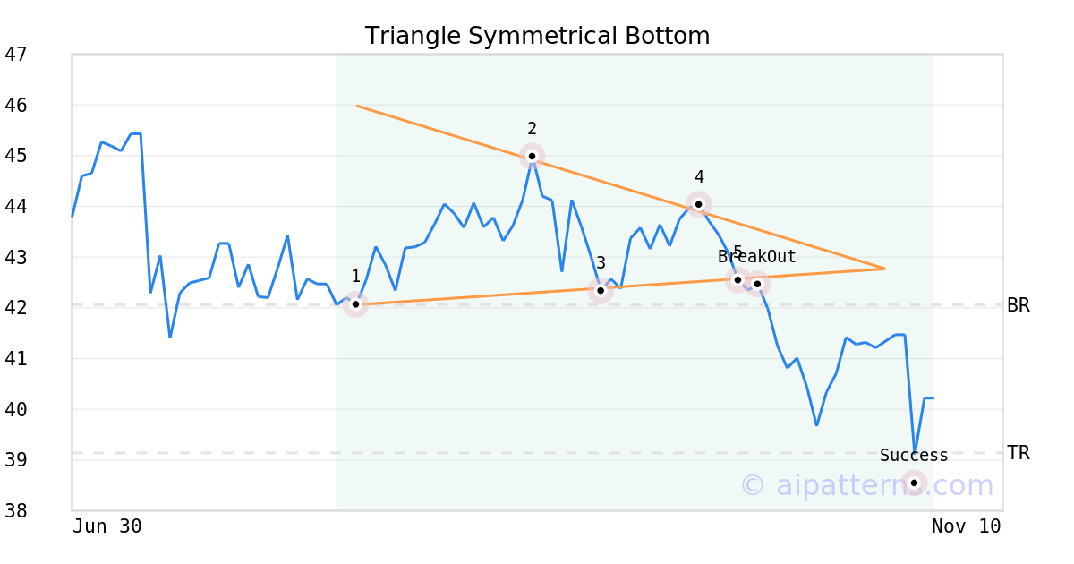 On October 06, 2025, A.I.dvisor detected a Triangle Symmetrical Bottom Pattern (Bearish) for ExlService Holdings (EXLS, $42.54). 2 days later, on October 08, 2025, A.I.dvisor confirmed the Bearish pattern, setting a target price of the stock. On October 29, 2025, the stock hit the target price of $39.14 – resulting in a gain for traders who shorted the stock on the pattern detection date.