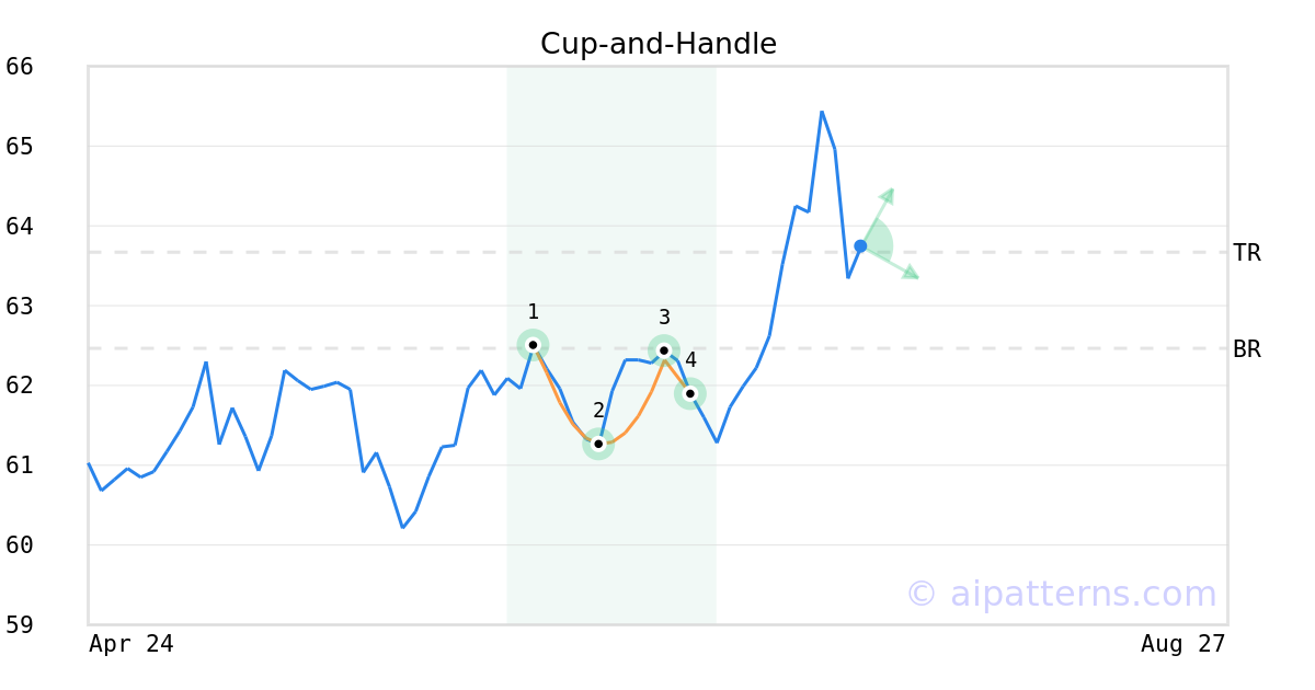 A.I.dvisor detected a bullish Cup-and-Handle pattern for FACDX stock. This pattern was detected on July 01, 2024 . The odds of reaching the target price are 6. The Cup-and-Handle (sometimes called Cup-and-Holder) pattern is formed when the price of a security initially declines and then rises to form a “U”-like rounded shape (1, 2, 3, also known as the Cup). Once it forms the right lip, it is characterized by short, relatively straight price decline (from 3 to 4) forming the handle. Consider buying a security or call option at the upward breakout price/entry point. The confirmation move is when the security moves past the breakout price above the right cup lip.