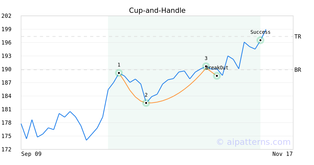 On October 29, 2025, A.I.dvisor detected a Cup-and-Handle Pattern (Bullish) for First Trust NYSE Arca Biotech ETF (FBT, $188.50). On October 29, 2025, A.I.dvisor confirmed the Bullish pattern, setting a target price of $197.37. 12 days later, on November 10, 2025, FBT reached the target price resulting in a for traders who took a long position in the stock.