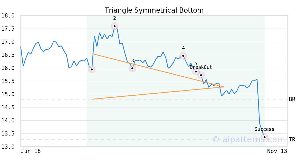 On September 26, 2025, A.I.dvisor detected a Triangle Symmetrical Bottom Pattern (Bearish) for YieldMax META Option Income Strategy ETF (FBY, $15.16). 4 days later, on September 30, 2025, A.I.dvisor confirmed the Bearish pattern, setting a target price of the stock. On November 03, 2025, the stock hit the target price of $13.28 – resulting in a +1 gain for traders who shorted the stock on the pattern detection date.