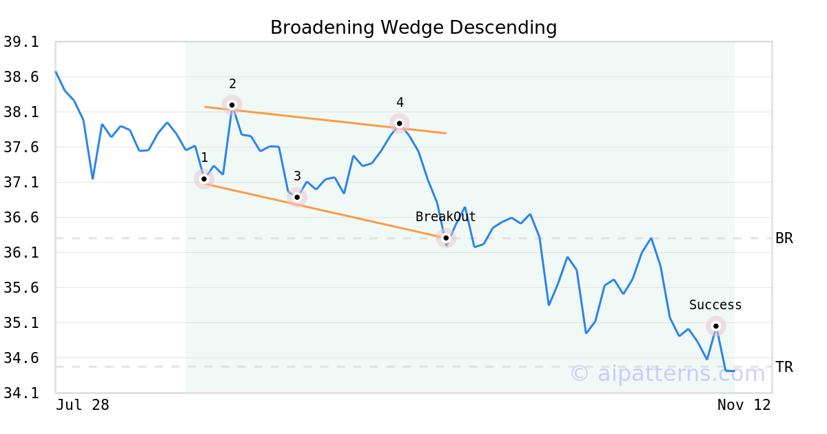 On September 25, 2025, A.I.dvisor detected a Broadening Wedge Descending Pattern (Bearish) for Fidelity Disruptive Finance ETF (FDFF, $36.30). On September 25, 2025, A.I.dvisor confirmed the Bearish pattern, setting a target price of the stock. On November 05, 2025, the stock hit the target price of $34.47 – resulting in a gain for traders who shorted the stock on the pattern detection date.