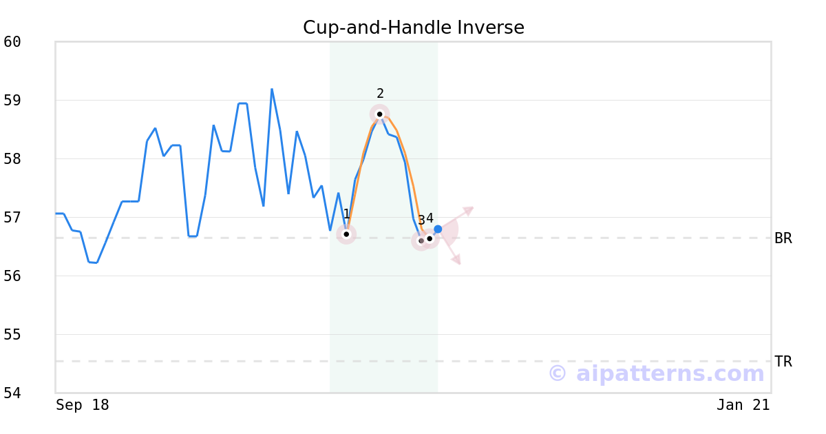 The Inverted Cup-and-Handle (sometimes called Inverted Cup-and-Holder) pattern forms when prices rise then decline to create an upside-down “U”like shape (1, 2, 3, also known as the Cup), followed by a shorter relatively straight price increase that bounces from the right lip (from 3 to 4, creating the Handle).