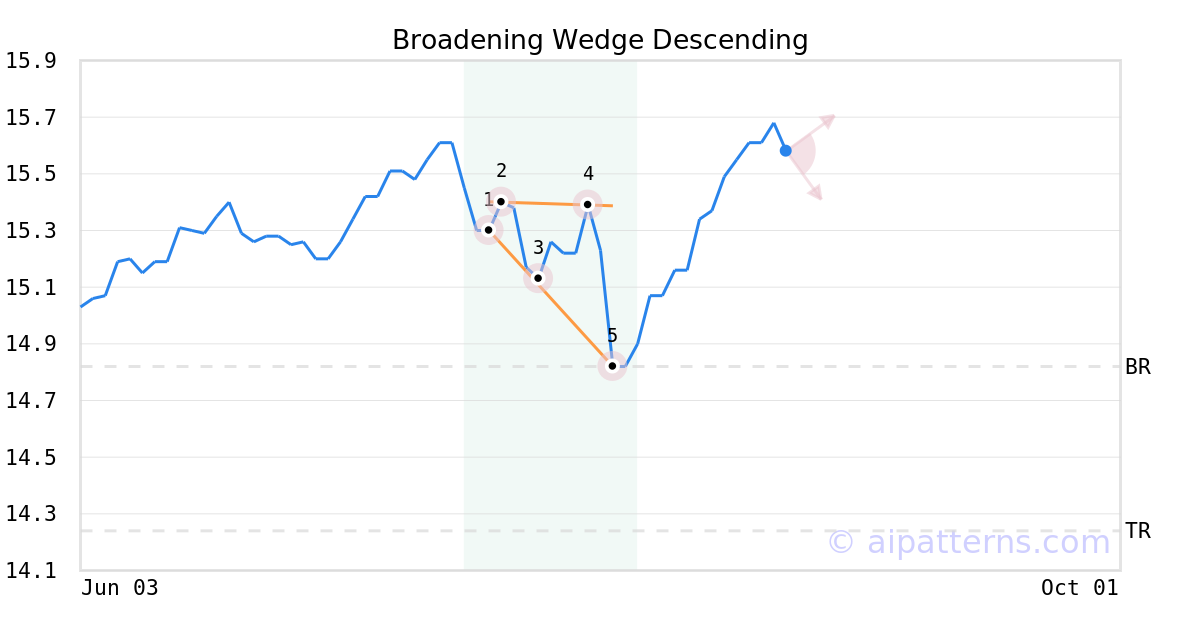 A.I.dvisor detected a bearish Broadening Wedge Descending pattern for FFARX stock. This pattern was detected on August 05, 2024 . The odds of reaching the target price are 6. The Broadening Wedge Descending pattern forms when a security price makes lower lows (1, 3, 5) and lower highs (2, 4), forming two downward sloping lines that expand over time. Consider selling the security short or buying a put option at the downward breakout price level, which is the last low touching the bottom line.