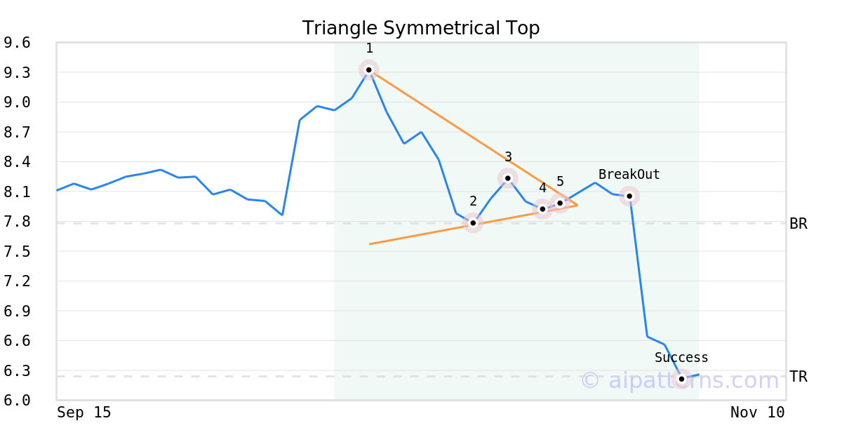 On October 24, 2025, A.I.dvisor detected a Triangle Symmetrical Top Pattern (Bearish) for First Guaranty Bancshares (FGBI, $7.98). 5 days later, on October 29, 2025, A.I.dvisor confirmed the Bearish pattern, setting a target price of the stock. On November 03, 2025, the stock hit the target price of $6.24 – resulting in a +2 gain for traders who shorted the stock on the pattern detection date.