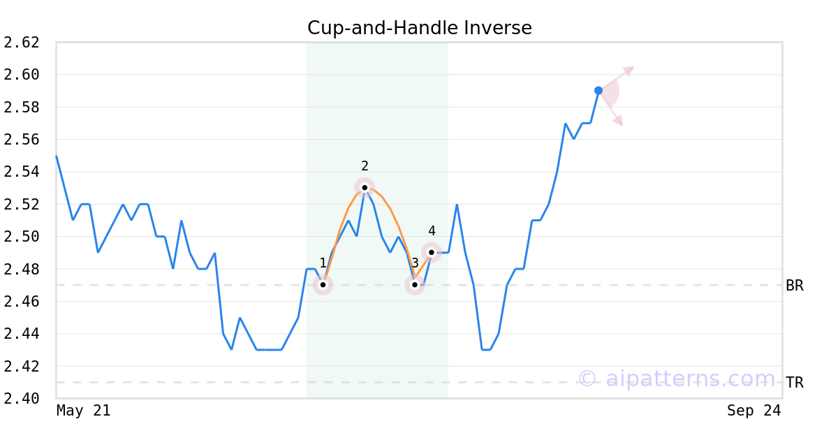 A.I.dvisor detected a bearish Cup-and-Handle Inverse pattern for FGGBX stock. This pattern was detected on July 29, 2024 . The odds of reaching the target price are 6. The Inverted Cup-and-Handle (sometimes called Inverted Cup-and-Holder) pattern forms when prices rise then decline to create an upside-down “U”like shape (1, 2, 3, also known as the Cup), followed by a shorter relatively straight price increase that bounces from the right lip (from 3 to 4, creating the Handle). Consider selling the security short or buying a put option at the downward breakout level. The confirmation move is the breakout of the price below the right cup lip.
