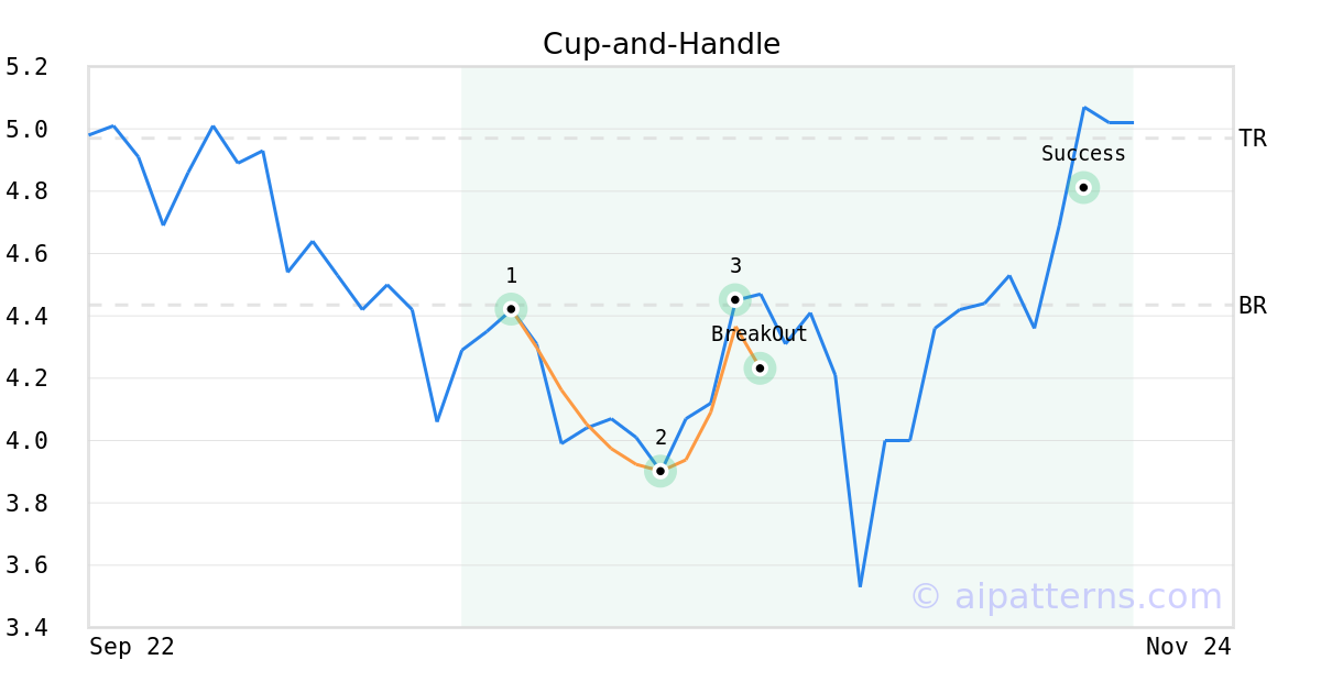 On October 29, 2025, A.I.dvisor detected a Cup-and-Handle Pattern (Bullish) for Foghorn Therapeutics (FHTX, $4.23). On October 29, 2025, A.I.dvisor confirmed the Bullish pattern, setting a target price of $4.97. 19 days later, on November 17, 2025, FHTX reached the target price resulting in a +1 for traders who took a long position in the stock.
