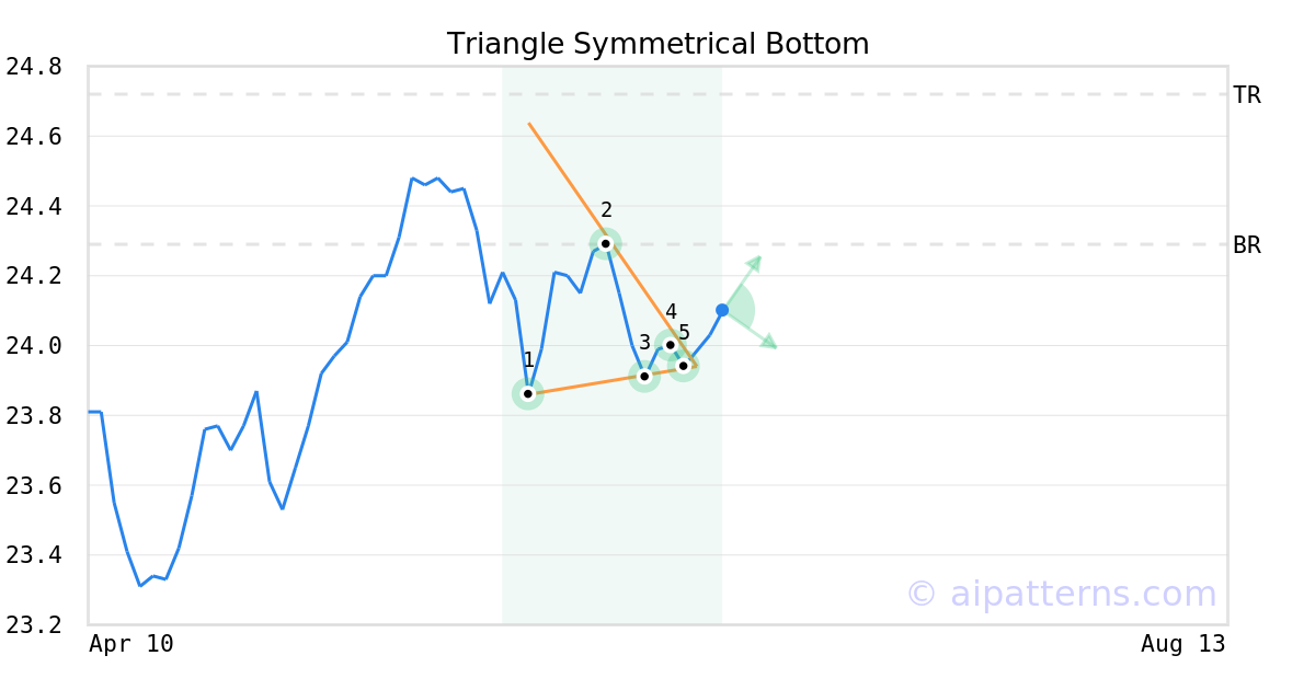 The Symmetrical Triangle Bottom pattern forms when the price of a security fails to retest a high or a low and ultimately forms two narrowing trend lines. As the support and resistance levels consolidate, they form a triangle.