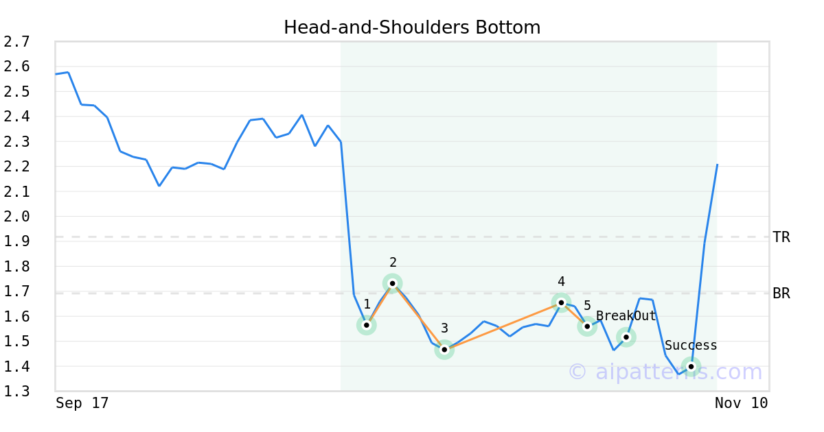 On October 28, 2025, A.I.dvisor detected a Head-and-Shoulders Bottom Pattern (Bullish) for Filecoin cryptocurrency (FIL.X, $1.558812). On October 31, 2025, A.I.dvisor confirmed the Bullish pattern, setting a target price of $1.918000. 5 days later, on November 05, 2025, FIL.X reached the target price resulting in a +1 for traders who took a long position in the stock.