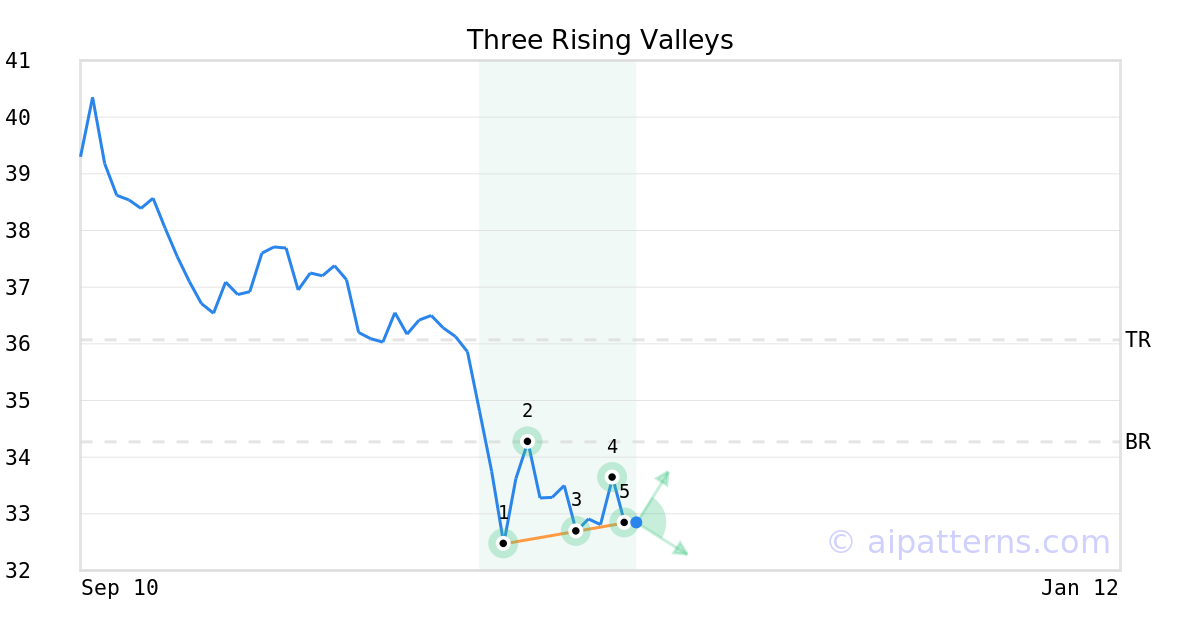 The Three Rising Valleys pattern forms when three minor Lows (1, 3, 5) are arranged along an upward sloping trend line.