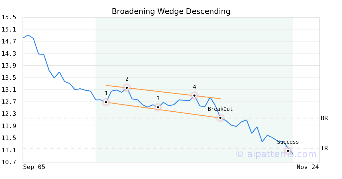 On October 29, 2025, A.I.dvisor detected a Broadening Wedge Descending Pattern (Bearish) for Flowers Foods (FLO, $12.16). On October 29, 2025, A.I.dvisor confirmed the Bearish pattern, setting a target price of the stock. On November 17, 2025, the stock hit the target price of $11.16 – resulting in a gain for traders who shorted the stock on the pattern detection date.