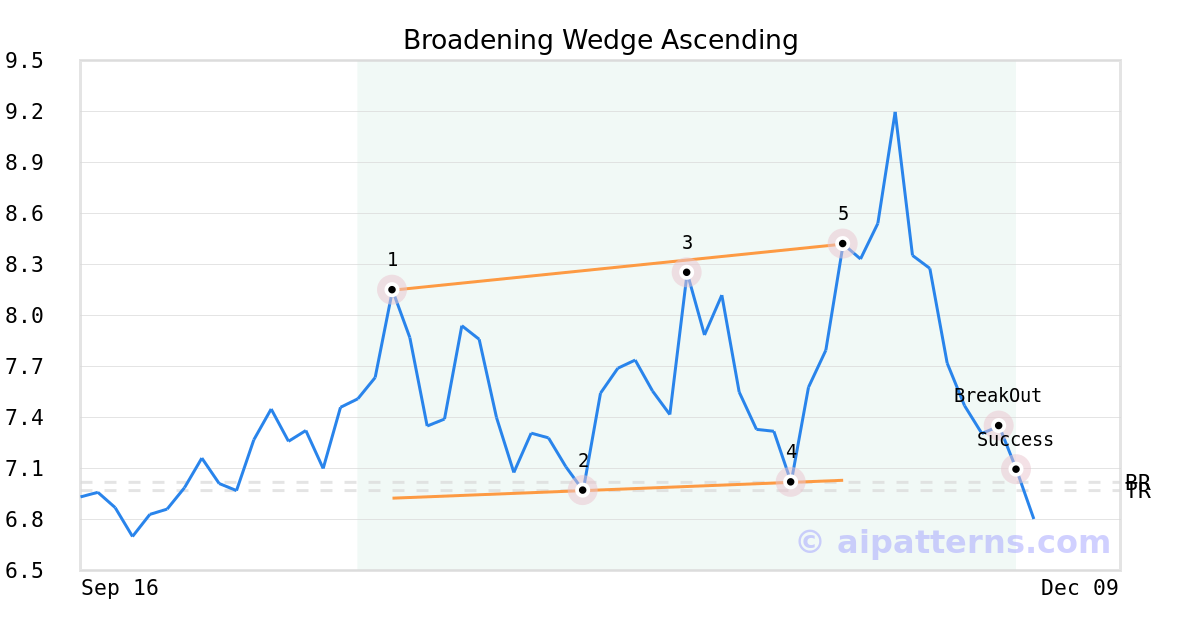 On November 17, 2025, A.I.dvisor detected a Broadening Wedge Ascending Pattern (Bearish) for MicroSectors™ Travel -3X Inv Lvgd ETNs (FLYD, $8.42). 14 days later, on December 01, 2025, A.I.dvisor confirmed the Bearish pattern, setting a target price of the stock. On December 02, 2025, the stock hit the target price of $6.97 – resulting in a +1 gain for traders who shorted the stock on the pattern detection date.