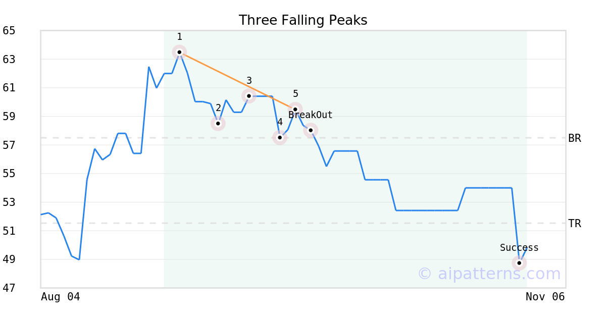 On September 19, 2025, A.I.dvisor detected a Three Falling Peaks Pattern (Bearish) for MicroSectors™ Travel 3X Leveraged ETNs (FLYU, $59.47). 4 days later, on September 23, 2025, A.I.dvisor confirmed the Bearish pattern, setting a target price of the stock. On October 30, 2025, the stock hit the target price of $51.53 – resulting in a +1 gain for traders who shorted the stock on the pattern detection date.