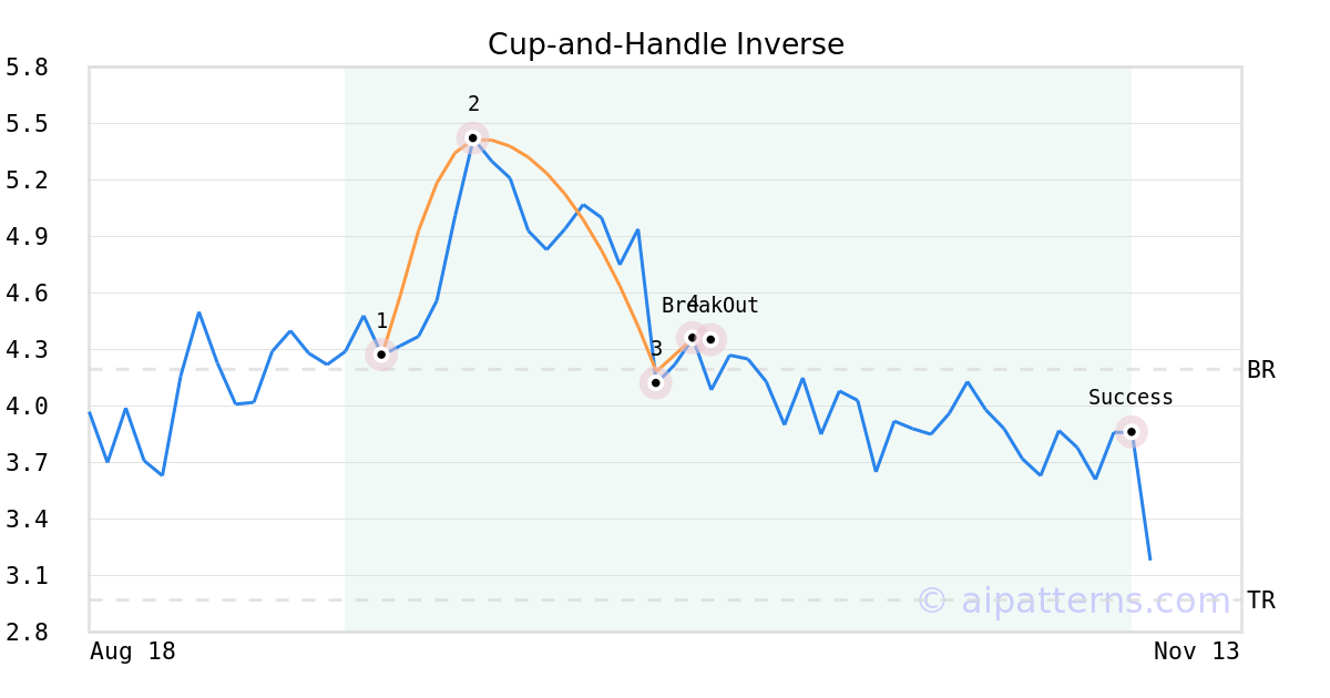 On October 03, 2025, A.I.dvisor detected a Cup-and-Handle Inverse Pattern (Bearish) for flyExclusive (FLYX, $4.36). 3 days later, on October 06, 2025, A.I.dvisor confirmed the Bearish pattern, setting a target price of the stock. On November 06, 2025, the stock hit the target price of $2.97 – resulting in a +1 gain for traders who shorted the stock on the pattern detection date.