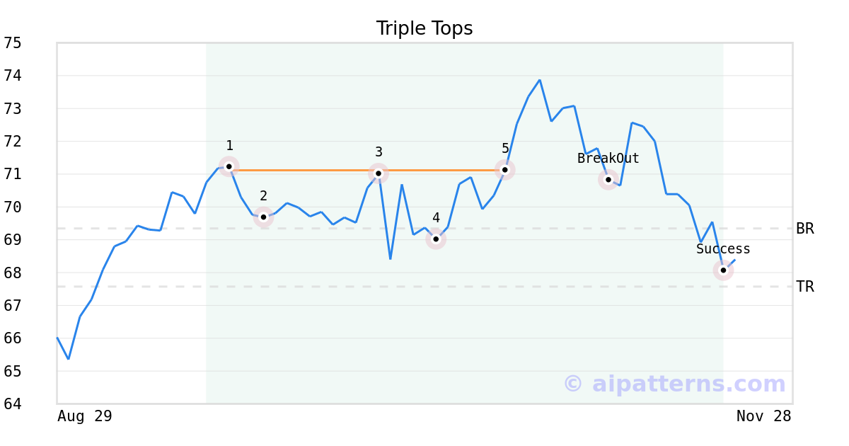 On October 24, 2025, A.I.dvisor detected a Triple Tops Pattern (Bearish) for MicroSectors™ FANG+™ ETN (FNGS, $71.12). 13 days later, on November 06, 2025, A.I.dvisor confirmed the Bearish pattern, setting a target price of the stock. On November 20, 2025, the stock hit the target price of $67.57 – resulting in a gain for traders who shorted the stock on the pattern detection date.