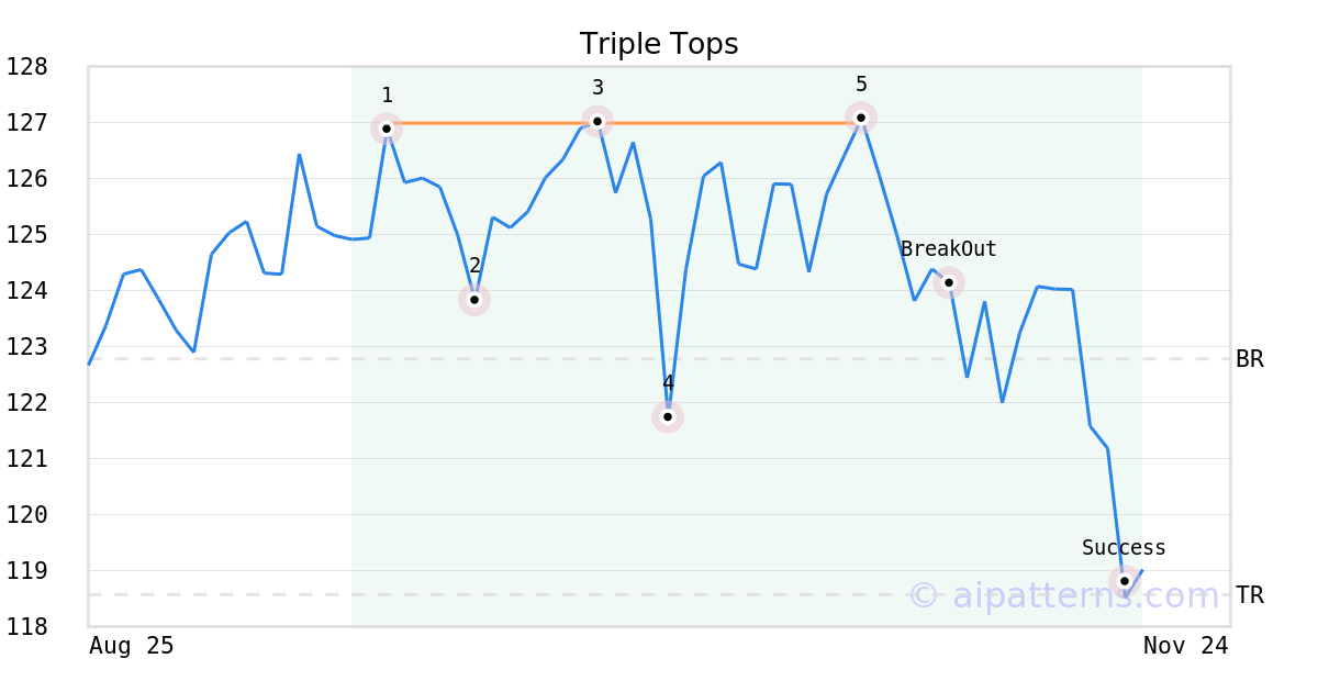 On October 27, 2025, A.I.dvisor detected a Triple Tops Pattern (Bearish) for First Trust Mid Cap Core AlphaDEX® ETF (FNX, $127.07). 7 days later, on November 03, 2025, A.I.dvisor confirmed the Bearish pattern, setting a target price of the stock. On November 17, 2025, the stock hit the target price of $118.57 – resulting in a gain for traders who shorted the stock on the pattern detection date.