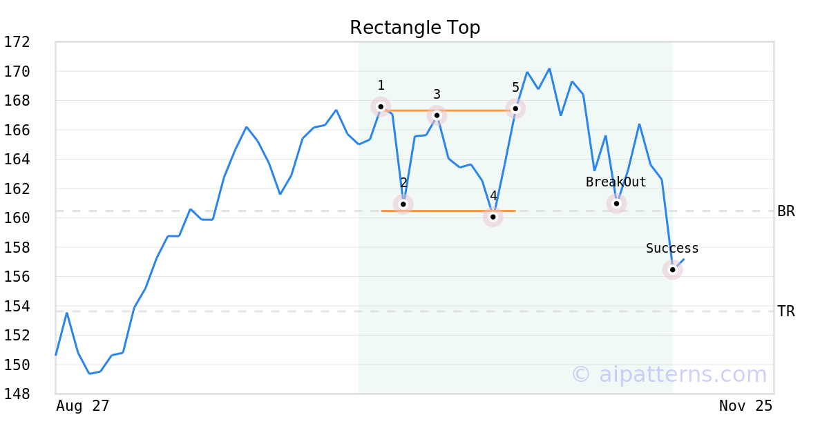 On October 24, 2025, A.I.dvisor detected a Rectangle Top Pattern (Bearish) for First Trust US Equity Opportunities ETF (FPX, $167.42). 13 days later, on November 06, 2025, A.I.dvisor confirmed the Bearish pattern, setting a target price of the stock. On November 13, 2025, the stock hit the target price of $153.63 – resulting in a gain for traders who shorted the stock on the pattern detection date.