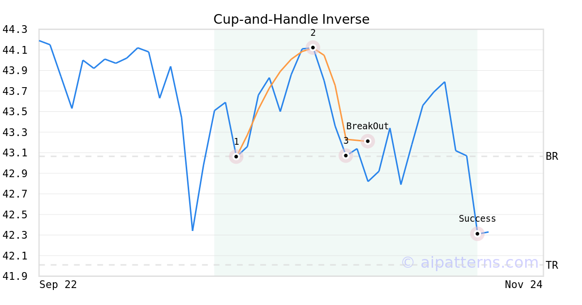 On November 03, 2025, A.I.dvisor detected a Cup-and-Handle Inverse Pattern (Bearish) for Fidelity Small-Mid Multifactor ETF (FSMD, $43.21). On November 03, 2025, A.I.dvisor confirmed the Bearish pattern, setting a target price of the stock. On November 17, 2025, the stock hit the target price of $42.01 – resulting in a gain for traders who shorted the stock on the pattern detection date.