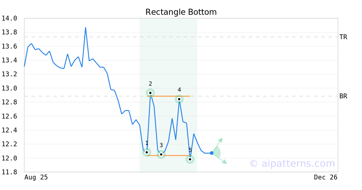 Two horizontal lines (1, 3, 5) and (2, 4) form the Rectangle Bottom Pattern as the security bounces up and down between support and resistance levels.
