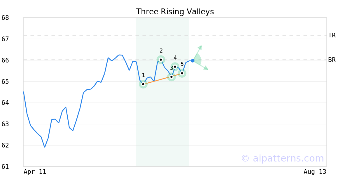 A.I.dvisor detected a bullish Three Rising Valleys pattern for FWCGX stock. This pattern was detected on June 14, 2024 . The odds of reaching the target price are 6. The Three Rising Valleys pattern forms when three minor Lows (1, 3, 5) are arranged along an upward sloping trend line. Consider buying a security or call option at the breakout price level. When trading, wait for the confirmation move, which is when the price rises above the breakout level.