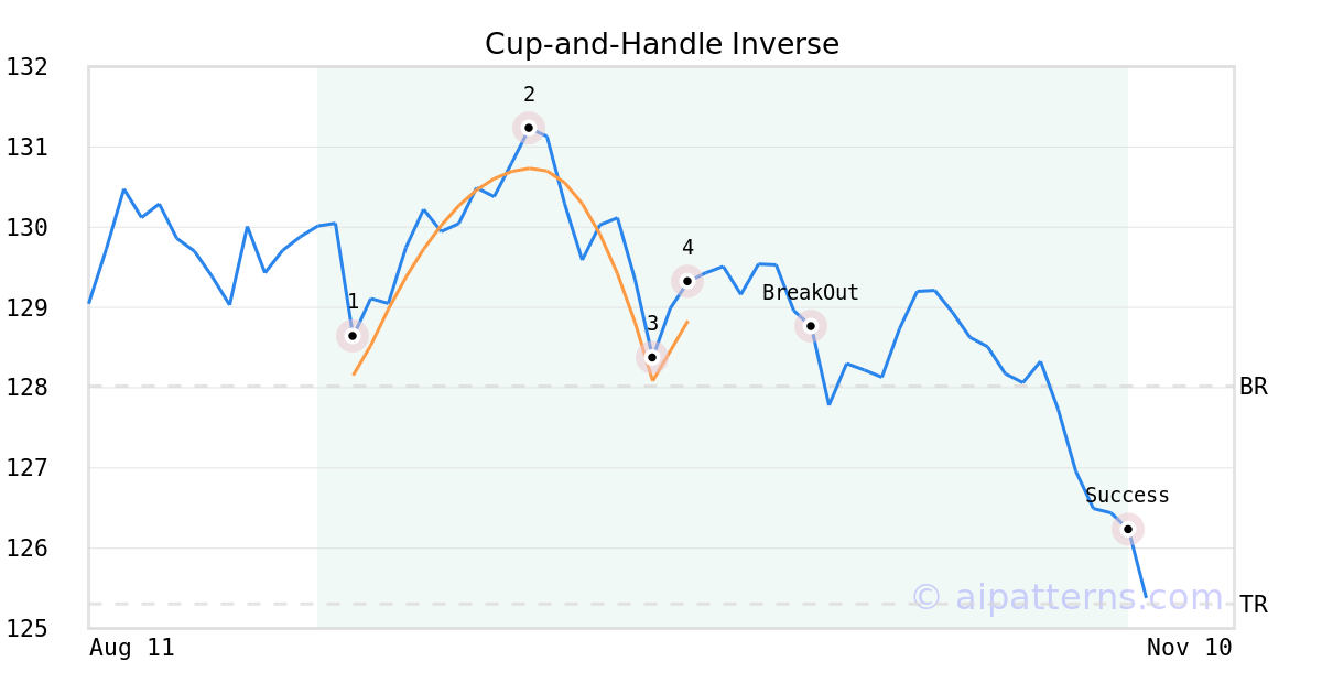 On September 29, 2025, A.I.dvisor detected a Cup-and-Handle Inverse Pattern (Bearish) for Invesco CcyShrs® British Pound Stlg (FXB, $128.83). 9 days later, on October 08, 2025, A.I.dvisor confirmed the Bearish pattern, setting a target price of the stock. On November 03, 2025, the stock hit the target price of $125.30 – resulting in a gain for traders who shorted the stock on the pattern detection date.