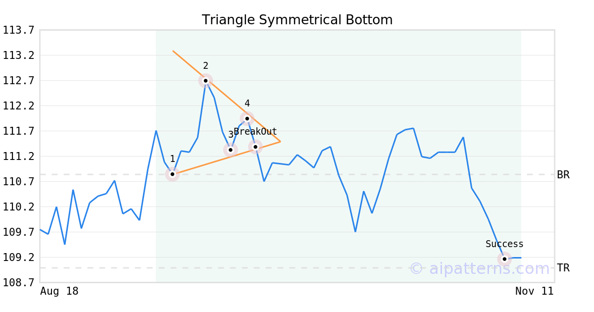 On September 24, 2025, A.I.dvisor detected a Triangle Symmetrical Bottom Pattern (Bearish) for Invesco CurrencyShares® Swiss Franc (FXF, $111.38). On September 24, 2025, A.I.dvisor confirmed the Bearish pattern, setting a target price of the stock. On November 04, 2025, the stock hit the target price of $108.99 – resulting in a gain for traders who shorted the stock on the pattern detection date.