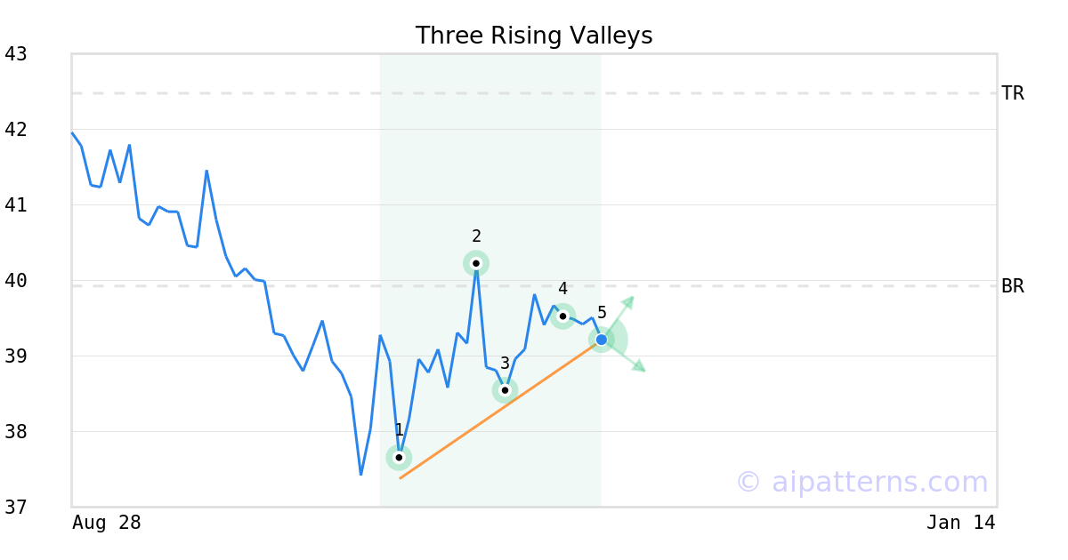 The Three Rising Valleys pattern forms when three minor Lows (1, 3, 5) are arranged along an upward sloping trend line.