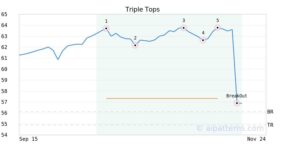 On November 11, 2025, A.I.dvisor detected a Triple Tops Pattern (Bearish) for General American Investors Company (GAM, $57.35). 6 days later, on November 17, 2025, A.I.dvisor confirmed the Bearish pattern, setting a target price of the stock. On November 17, 2025, the stock hit the target price of $54.91 – resulting in a gain for traders who shorted the stock on the pattern detection date.