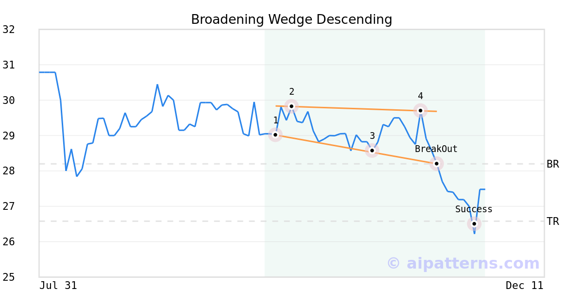 On November 13, 2025, A.I.dvisor detected a Broadening Wedge Descending Pattern (Bearish) for Global Indemnity Group LLC (GBLI, $28.20). On November 13, 2025, A.I.dvisor confirmed the Bearish pattern, setting a target price of the stock. On November 24, 2025, the stock hit the target price of $26.58 – resulting in a gain for traders who shorted the stock on the pattern detection date.