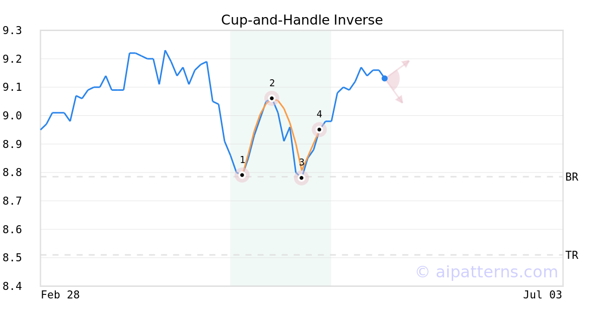 The Inverted Cup-and-Handle (sometimes called Inverted Cup-and-Holder) pattern forms when prices rise then decline to create an upside-down “U”like shape (1, 2, 3, also known as the Cup), followed by a shorter relatively straight price increase that bounces from the right lip (from 3 to 4, creating the Handle).