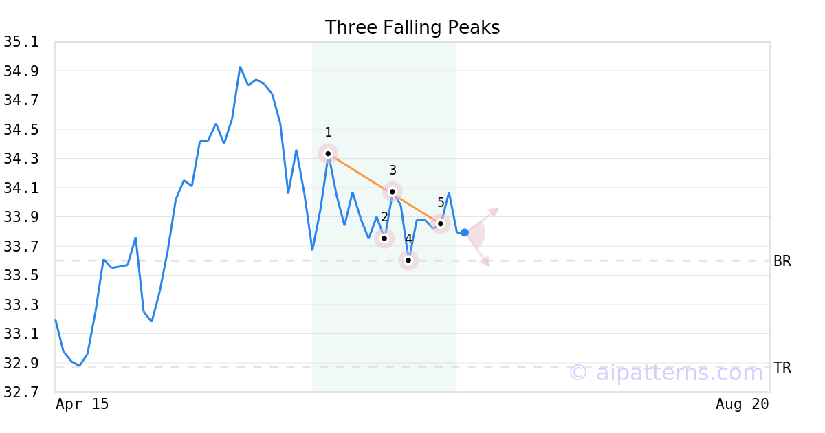 The Three Falling Peaks pattern forms when three minor Highs (1, 3, 5) arrange along a downward-sloping trend line.