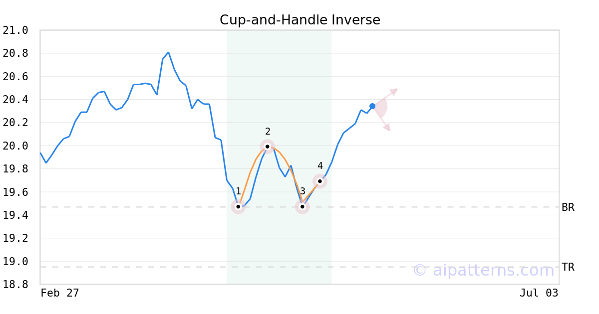 A.I.dvisor detected a bearish Cup-and-Handle Inverse pattern for GDIIX stock. This pattern was detected on May 06, 2024 . The odds of reaching the target price are . The Inverted Cup-and-Handle (sometimes called Inverted Cup-and-Holder) pattern forms when prices rise then decline to create an upside-down “U”like shape (1, 2, 3, also known as the Cup), followed by a shorter relatively straight price increase that bounces from the right lip (from 3 to 4, creating the Handle). Consider selling the security short or buying a put option at the downward breakout level. The confirmation move is the breakout of the price below the right cup lip.