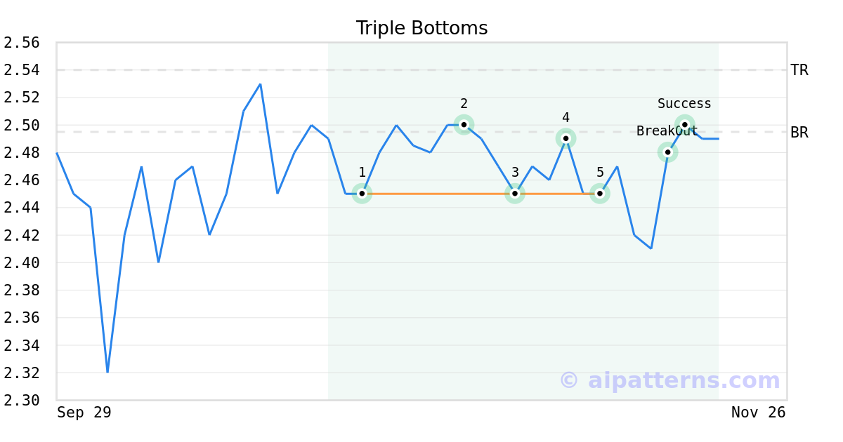 On November 12, 2025, A.I.dvisor detected a Triple Bottoms Pattern (Bullish) for Great Elm Group (GEG, $2.45). On November 18, 2025, A.I.dvisor confirmed the Bullish pattern, setting a target price of $2.54. 1 day later, on November 19, 2025, GEG reached the target price resulting in a for traders who took a long position in the stock.