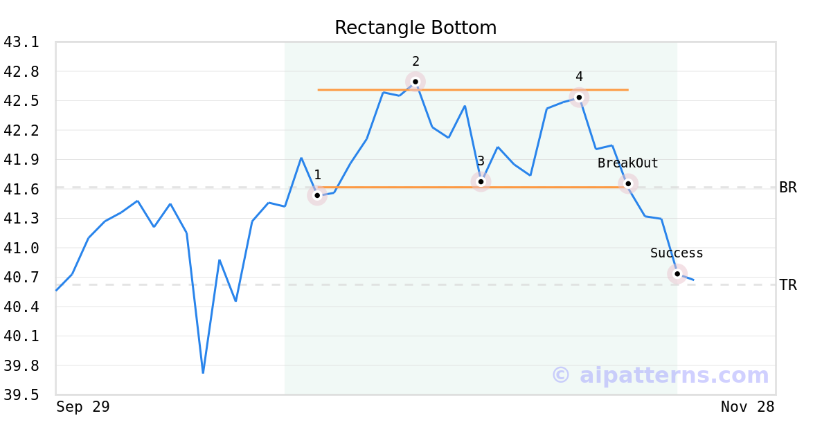 On November 17, 2025, A.I.dvisor detected a Rectangle Bottom Pattern (Bearish) for Goldman Sachs ActiveBeta® EMkts Eq ETF (GEM, $41.65). On November 17, 2025, A.I.dvisor confirmed the Bearish pattern, setting a target price of the stock. On November 20, 2025, the stock hit the target price of $40.62 – resulting in a gain for traders who shorted the stock on the pattern detection date.