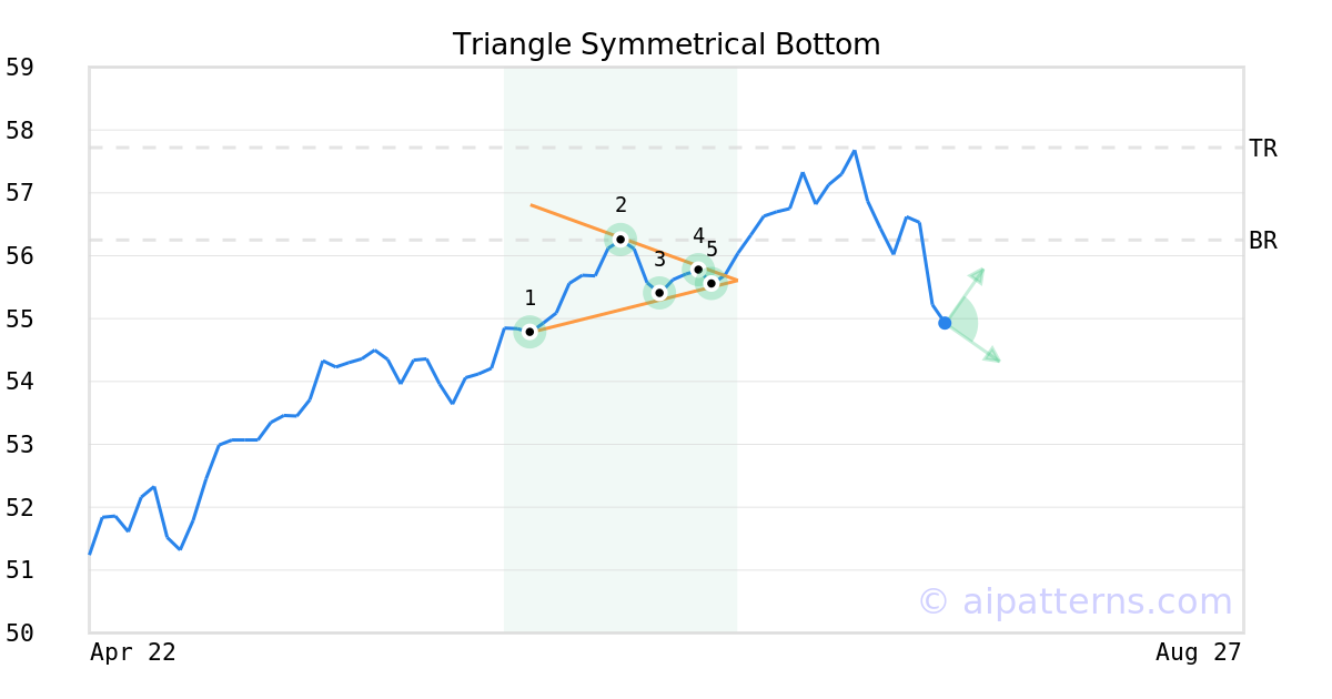 The Symmetrical Triangle Bottom pattern forms when the price of a security fails to retest a high or a low and ultimately forms two narrowing trend lines. As the support and resistance levels consolidate, they form a triangle.