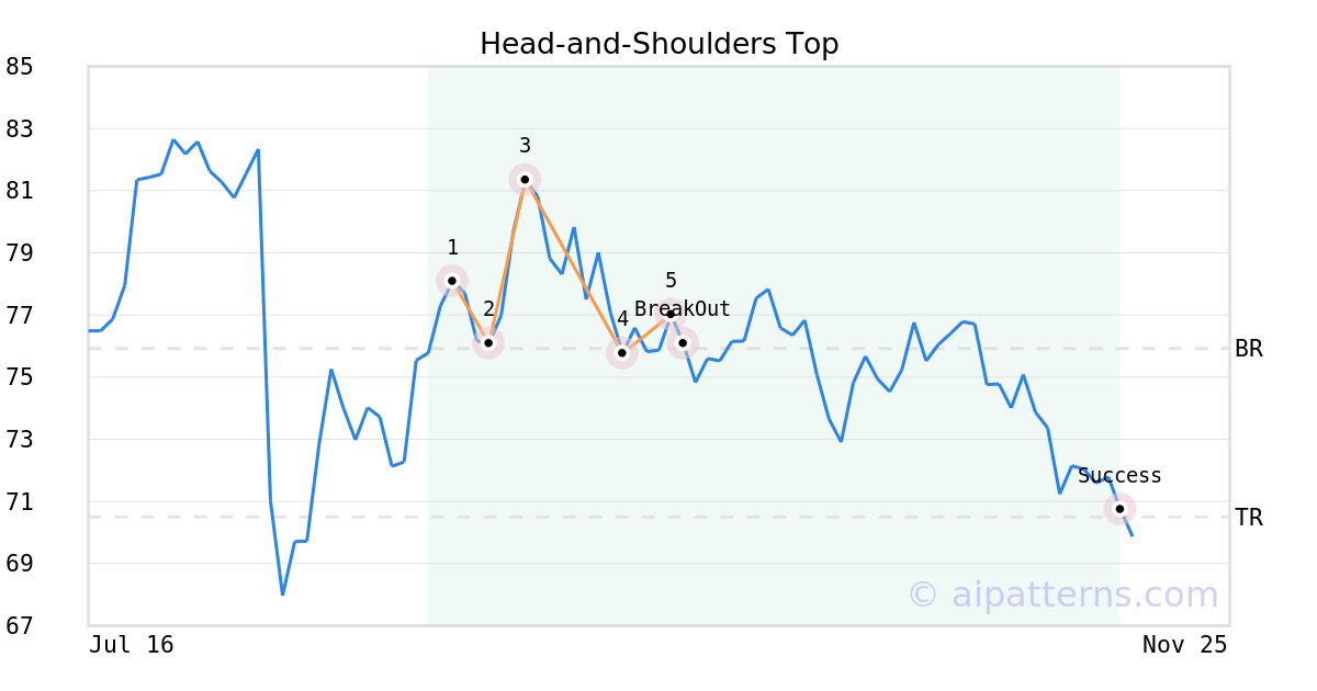 On September 23, 2025, A.I.dvisor detected a Head-and-Shoulders Top Pattern (Bearish) for Griffon Corp (GFF, $77.01). 1 day later, on September 24, 2025, A.I.dvisor confirmed the Bearish pattern, setting a target price of the stock. On November 13, 2025, the stock hit the target price of $70.50 – resulting in a gain for traders who shorted the stock on the pattern detection date.