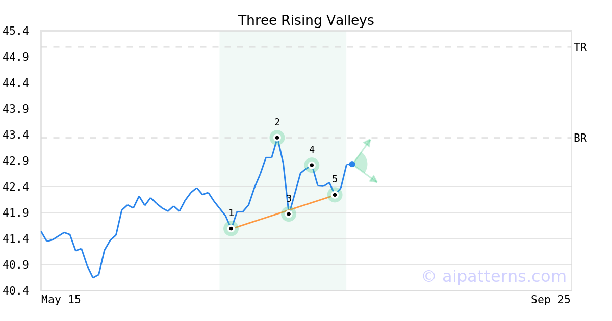 The Three Rising Valleys pattern forms when three minor Lows (1, 3, 5) are arranged along an upward sloping trend line.