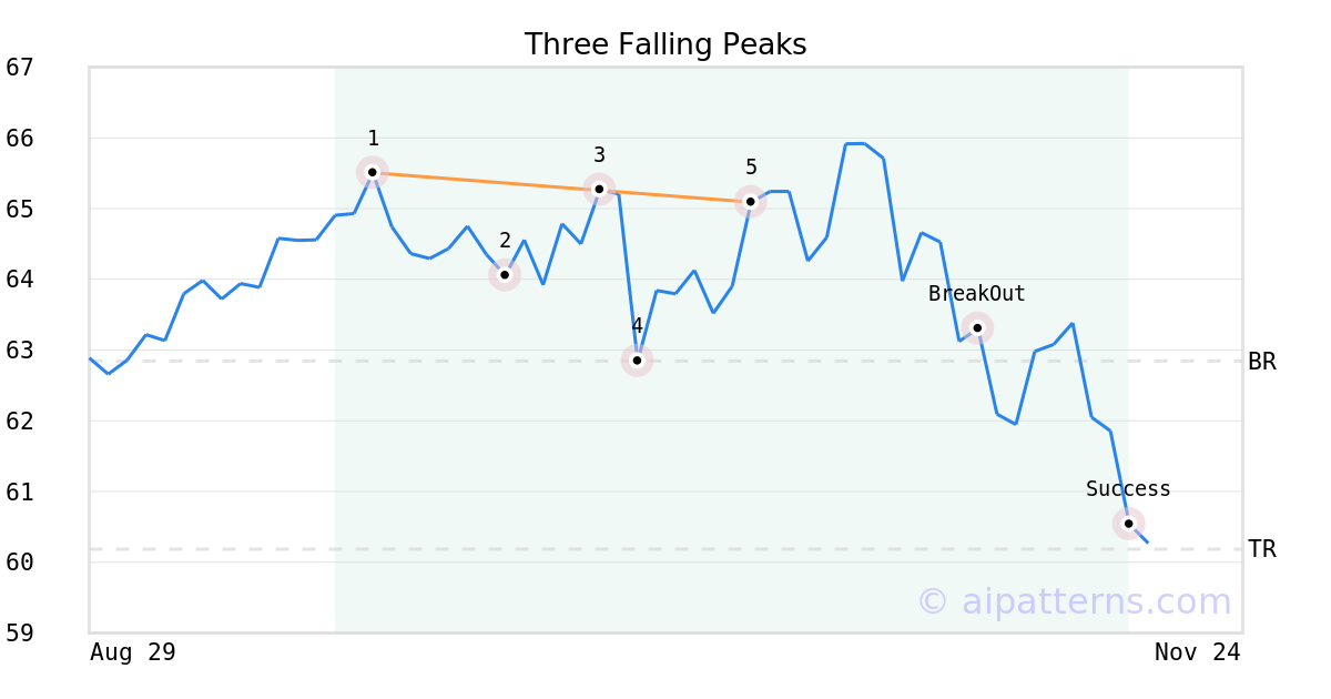 On October 20, 2025, A.I.dvisor detected a Three Falling Peaks Pattern (Bearish) for Invesco Next Gen Media and Gaming ETF (GGME, $65.09). 16 days later, on November 05, 2025, A.I.dvisor confirmed the Bearish pattern, setting a target price of the stock. On November 17, 2025, the stock hit the target price of $60.18 – resulting in a gain for traders who shorted the stock on the pattern detection date.