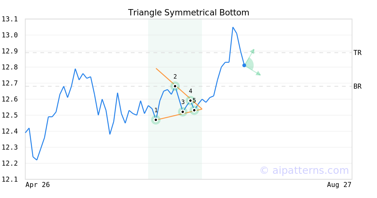 The Symmetrical Triangle Bottom pattern forms when the price of a security fails to retest a high or a low and ultimately forms two narrowing trend lines. As the support and resistance levels consolidate, they form a triangle.