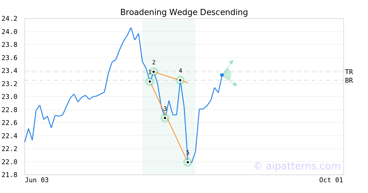 A.I.dvisor detected a bullish Broadening Wedge Descending pattern for GIRMX stock. This pattern was detected on August 05, 2024 . The odds of reaching the target price are 6. The Broadening Wedge Descending pattern forms when the price of a security makes lower lows (1, 3, 5) and lower highs (2, 4), forming a downtrend. Consider buying a security or call option at the upward breakout price level.