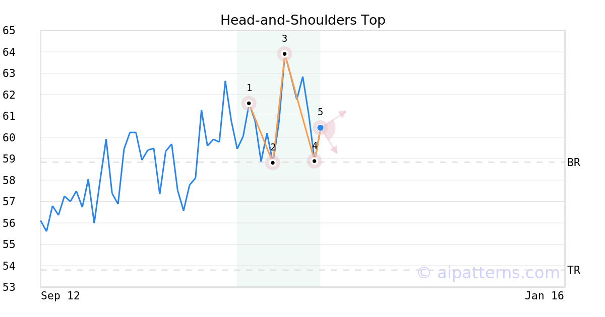 The pattern forms with a center peak (the Head, labeled 3) and left and right Shoulders (1, 5). Eventually the security stops testing highs and reverses trend into a decline.