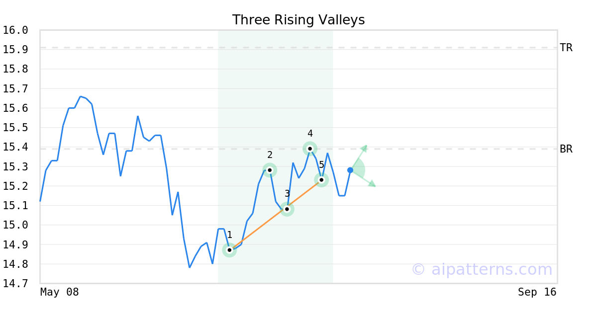 A.I.dvisor detected a bullish Three Rising Valleys pattern for GMAZX stock. This pattern was detected on July 19, 2024 . The odds of reaching the target price are 6. The Three Rising Valleys pattern forms when three minor Lows (1, 3, 5) are arranged along an upward sloping trend line. Consider buying a security or call option at the breakout price level. When trading, wait for the confirmation move, which is when the price rises above the breakout level.