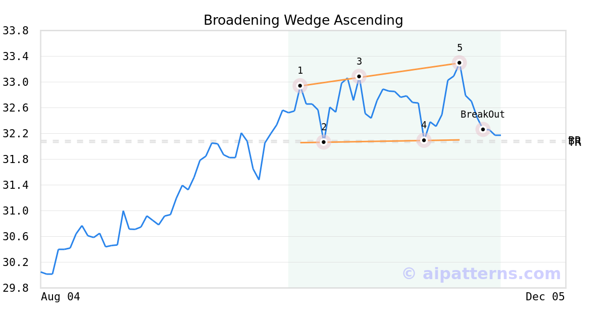 On November 12, 2025, A.I.dvisor detected a Broadening Wedge Ascending Pattern (Bearish) for Cambria Global Momentum ETF (GMOM, $33.30). 6 days later, on November 18, 2025, A.I.dvisor confirmed the Bearish pattern, setting a target price of the stock. On November 18, 2025, the stock hit the target price of $32.06 – resulting in a gain for traders who shorted the stock on the pattern detection date.